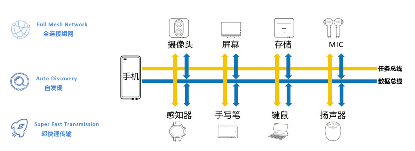 - 分布式软总线:支持终端设备自发现、自连接、自组网,简化分布式应用开发。