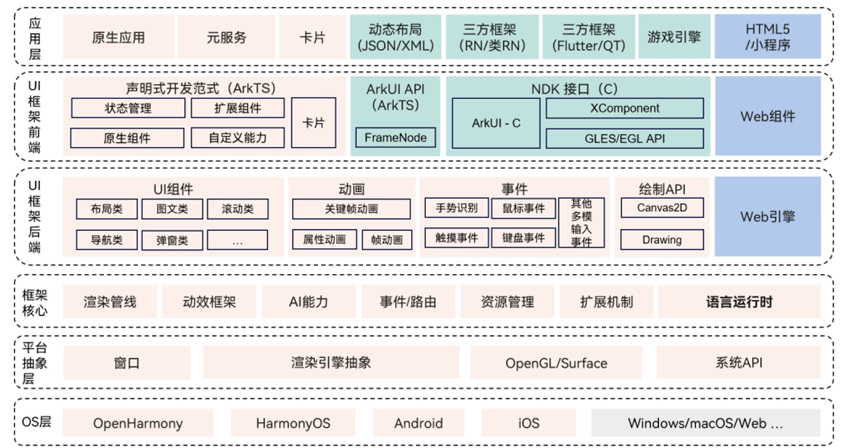 更重要的是,ArkUI 的提出标志着鸿蒙在 UI框架层面的体系化创新。它不仅重新定义了界面渲染与交互逻辑的组织方式,还通过 ArkTS(HarmonyOS专属的TypeScript扩展语言)、ArkUI框架层 与 ArkUI渲染引擎层 的协同,实现了从语言到渲染的全链路自研体系。该设计既保障了开发效率,又提升了系统性能与动画流畅度,体现出鸿蒙系统在自主创新与用户体验平衡上的深厚技术积累。