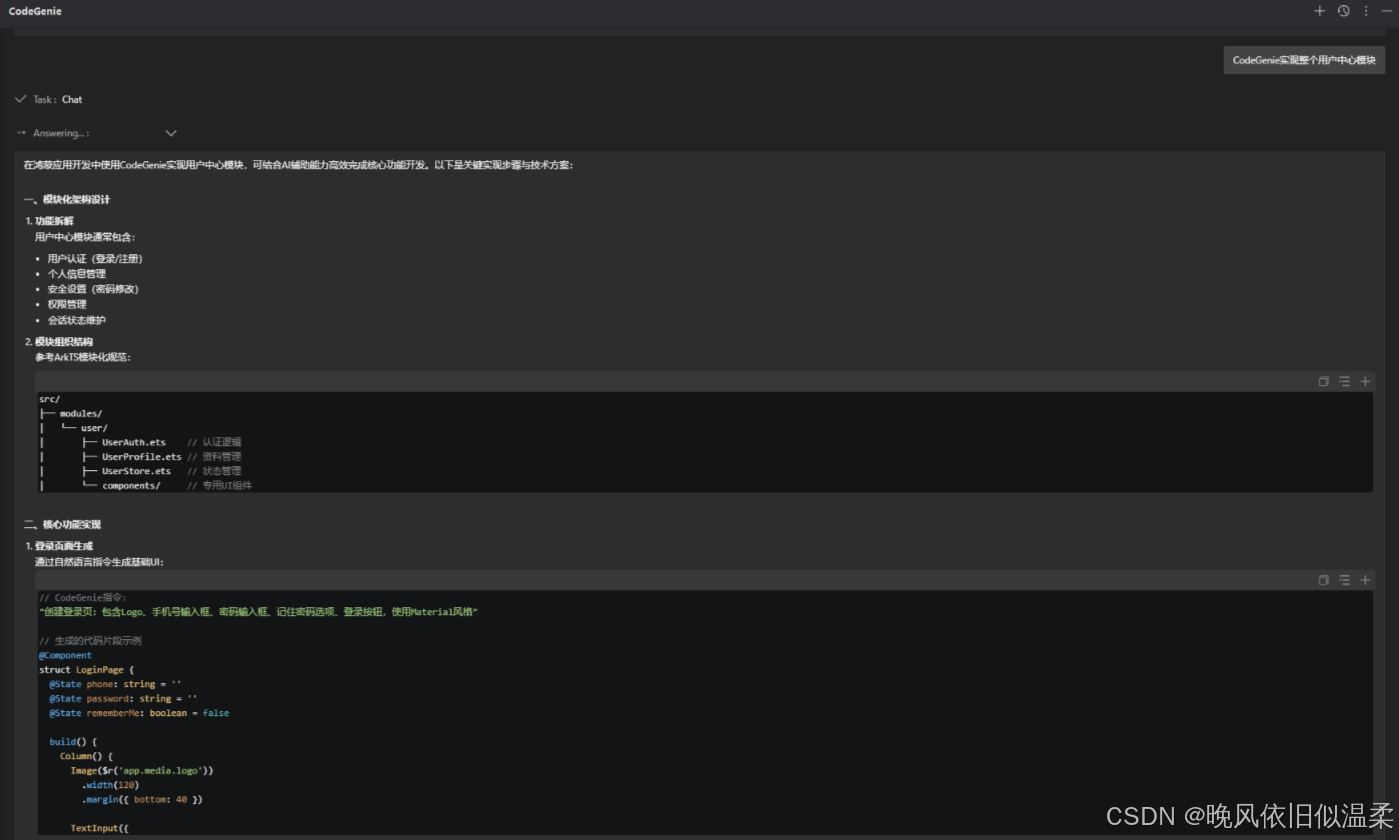 CodeGenie支持HarmonyOS NEXT领域的智能知识问答、ArkTS代码补全/生成和万能卡片生成能力,这三个功能构成了一个完整的开发支持体系。