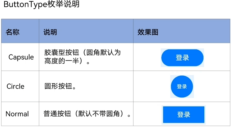 “Button 组件主要用来响应点击操作执行用户交互。其 type 属性支持 Capsule(胶囊型)、Normal(普通型)、Circle(圆形)三种类型。”