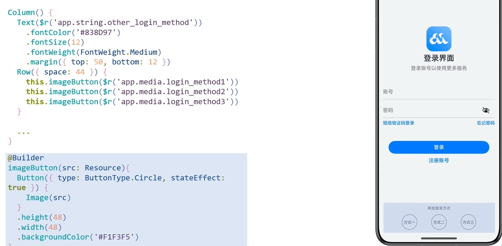 讲师还介绍了使用 Builder 装饰器(@Builder)实现 UI 封装与复用,例如多个样式一致的第三方登录按钮。这一设计思路体现了 ArkUI 框架在组件化开发上的灵活性和可维护性。
