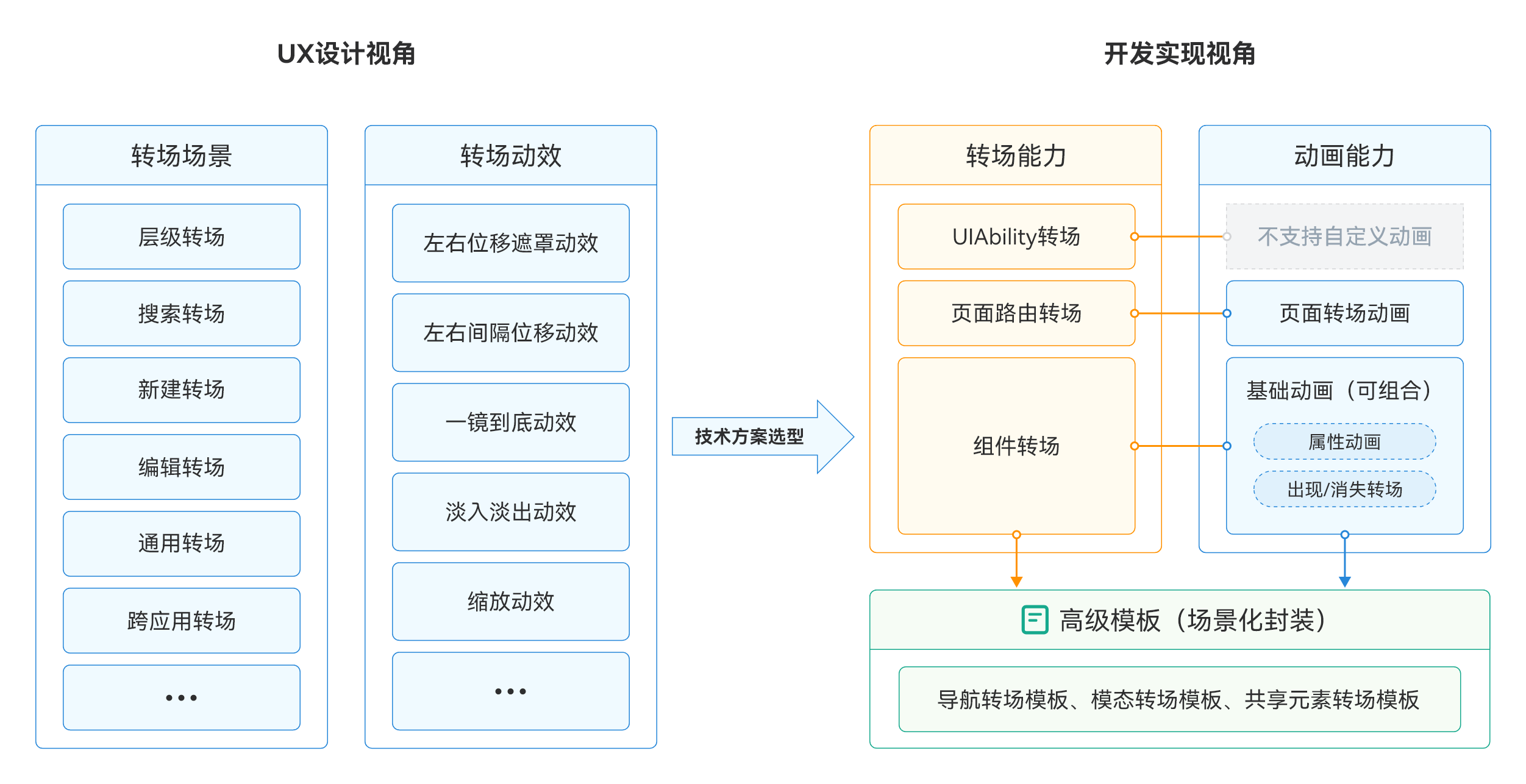 width、height、backgroundColor、opacity、scale、rotate、translate等。 - 转场动画:组件出现/消失时的过渡效果(插入/删除/可见性变化时触发)。