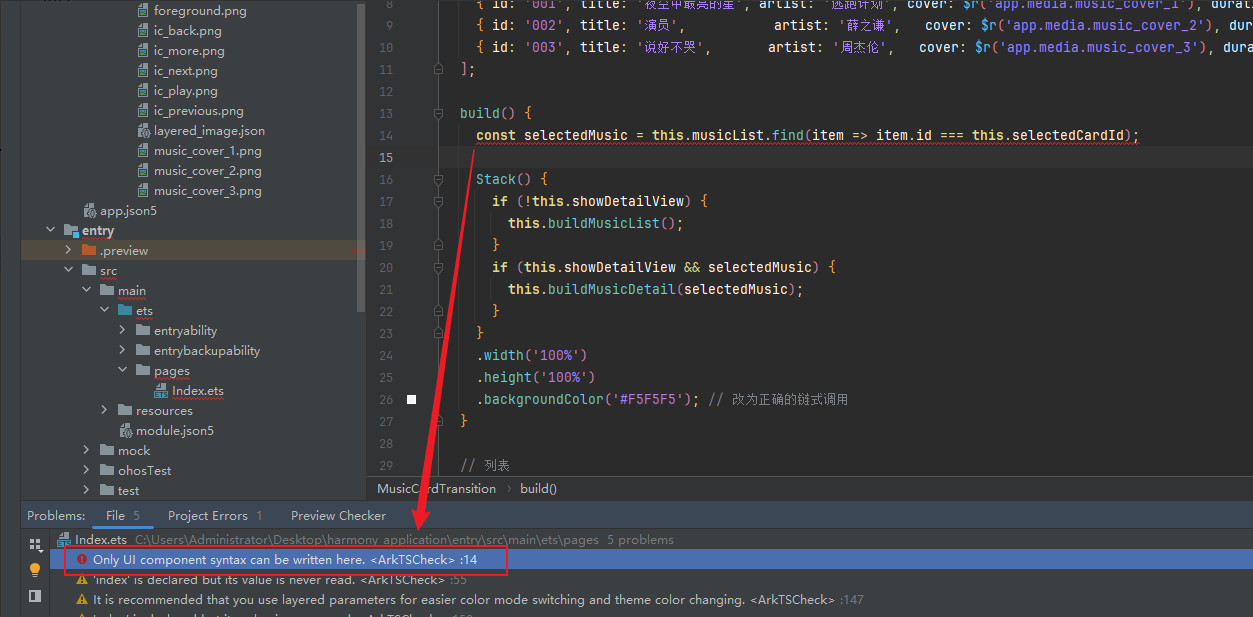 这个错误提示 Only UI component syntax can be written here. <ArkTSCheck> 表示在使用 DevEco 编程时,在 UI 组件的构建方法中写了非 UI 组件相关的逻辑(比如常规的 JavaScript 或 TypeScript 代码),这会导致编译器报错。