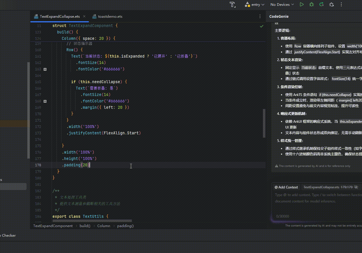基于强大的AI算法,CodeGenie能够根据开发者的输入和上下文,智能生成符合鸿蒙开发规范的ArkTS代码,大幅提升编码效率。
