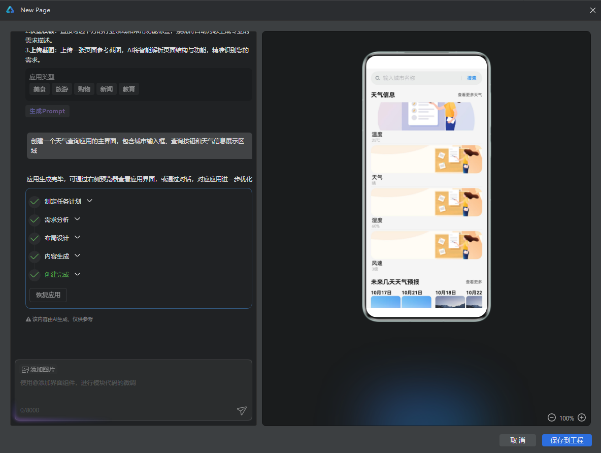 输入详细需求:"创建一个天气查询应用的主界面,包含城市输入框、查询按钮和天气信息展示区域"。AI会根据需求描述自动分析并生成相应的界面代码,整个过程通常在几秒内完成。