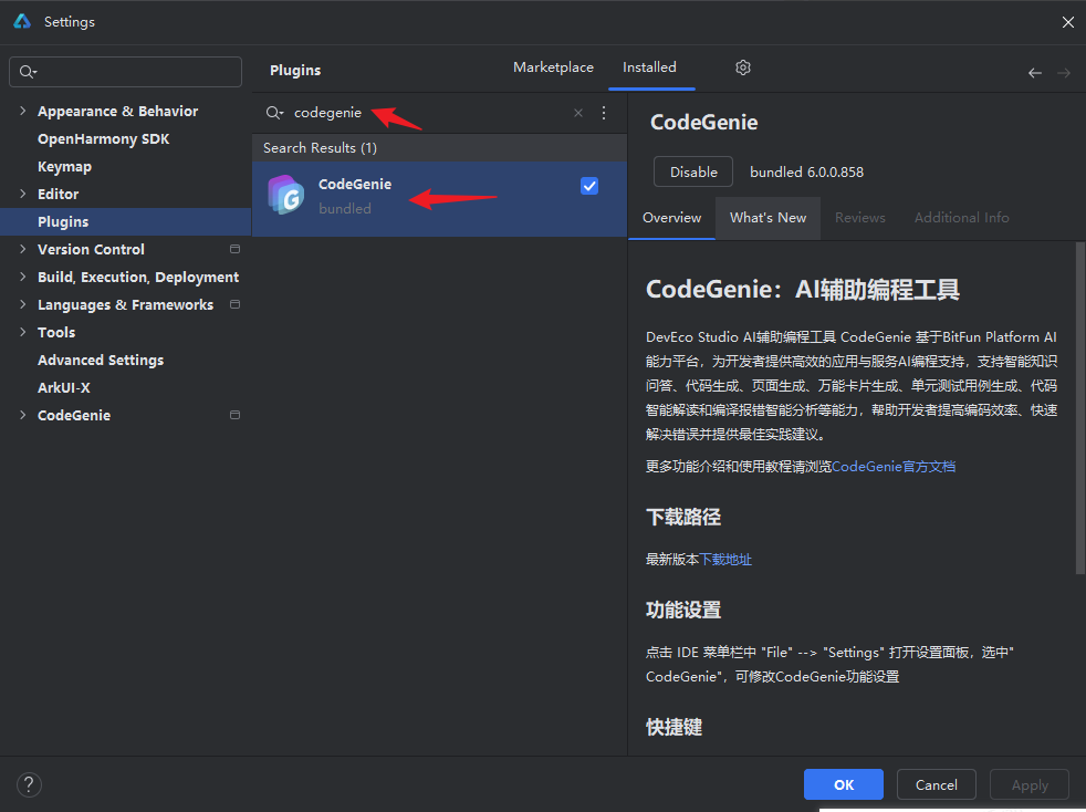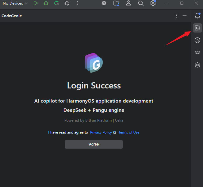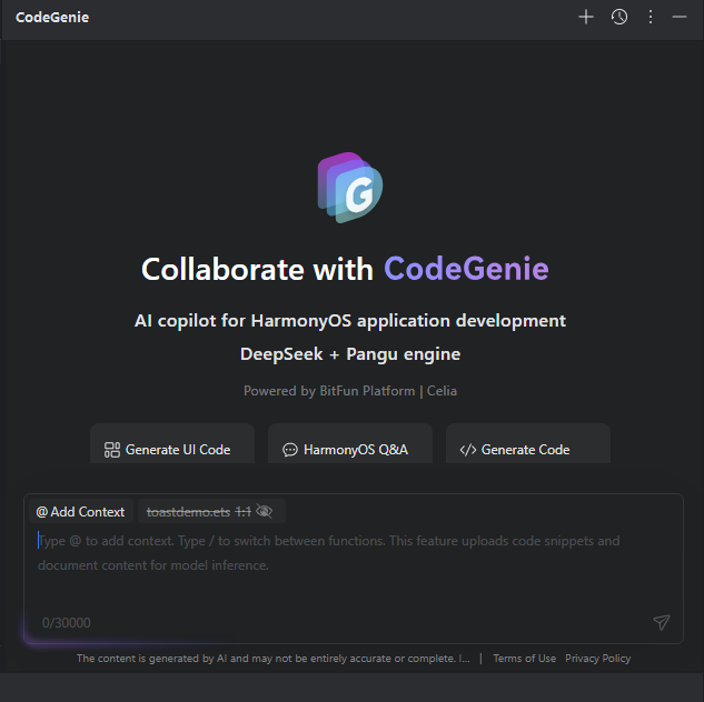 - 启动CodeGenie:在DevEco Studio右侧边栏找到并点击CodeGenie图标,插件安装成功后即可进入主界面。
