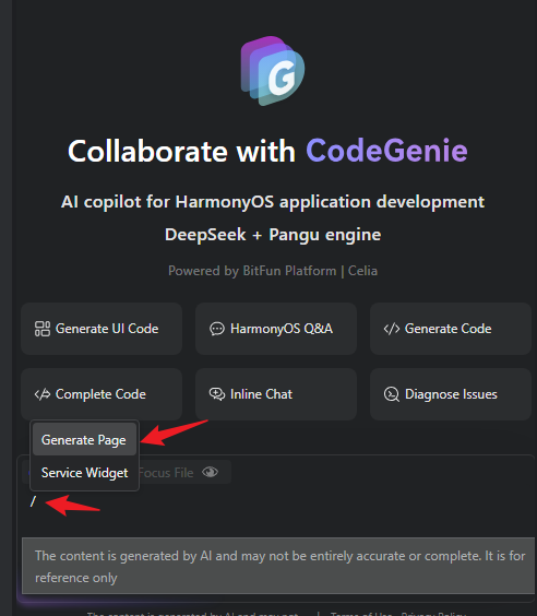 在CodeGenie中输入"/",从弹出菜单中选择"Generate Page"选项。
