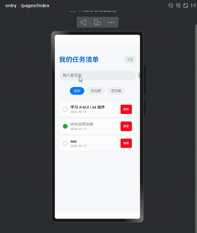 传统移动端常依赖手动刷新与繁琐的状态管理来驱动 UI 更新;而在 HarmonyOS 的 ArkTS 框架中,ArkUI 以“声明式 UI + 响应式数据绑定”重塑开发范式,显著简化界面构建与状态同步。本文以「任务管理」为例,完整实现增删改查、状态切换与筛选过滤等能力,展示从页面到逻辑的端到端实践。