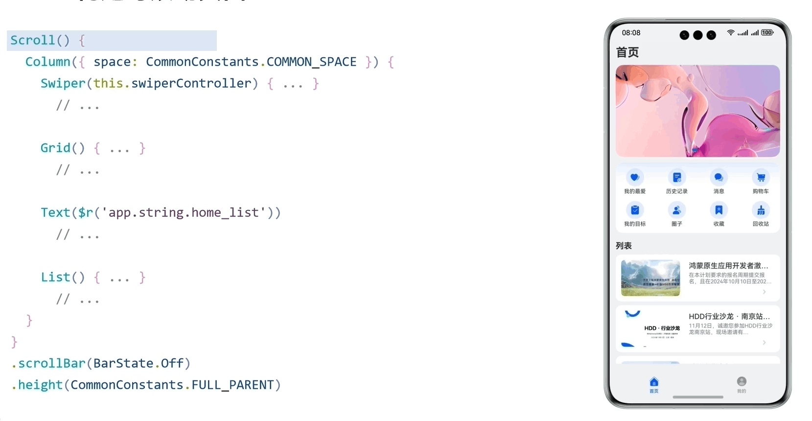 这种自上而下的布局思路,是 HarmonyOS ArkUI 的典型设计方式。页面内容一旦超出可视区域,还需要“通过 Scroll 组件构建可滚动页面”。