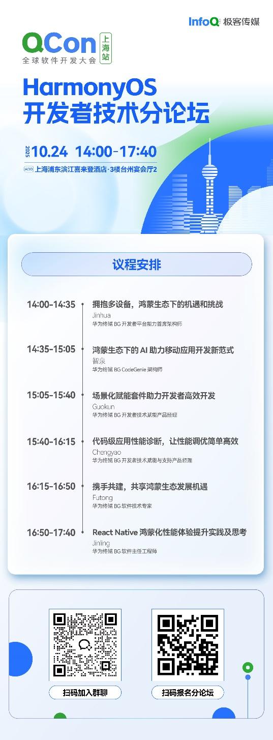 Qcon全球软件开发大会HarmonyOS开发者技术分论坛将于10月24日14:00于上海浦东滨江喜来登酒店3楼台州宴会厅2举行,本次分论坛设有6个议题,包括多设备协同开发、AI辅助开发、场景化赋能、性能调优、场景能力共建,RN框架等热门话题。