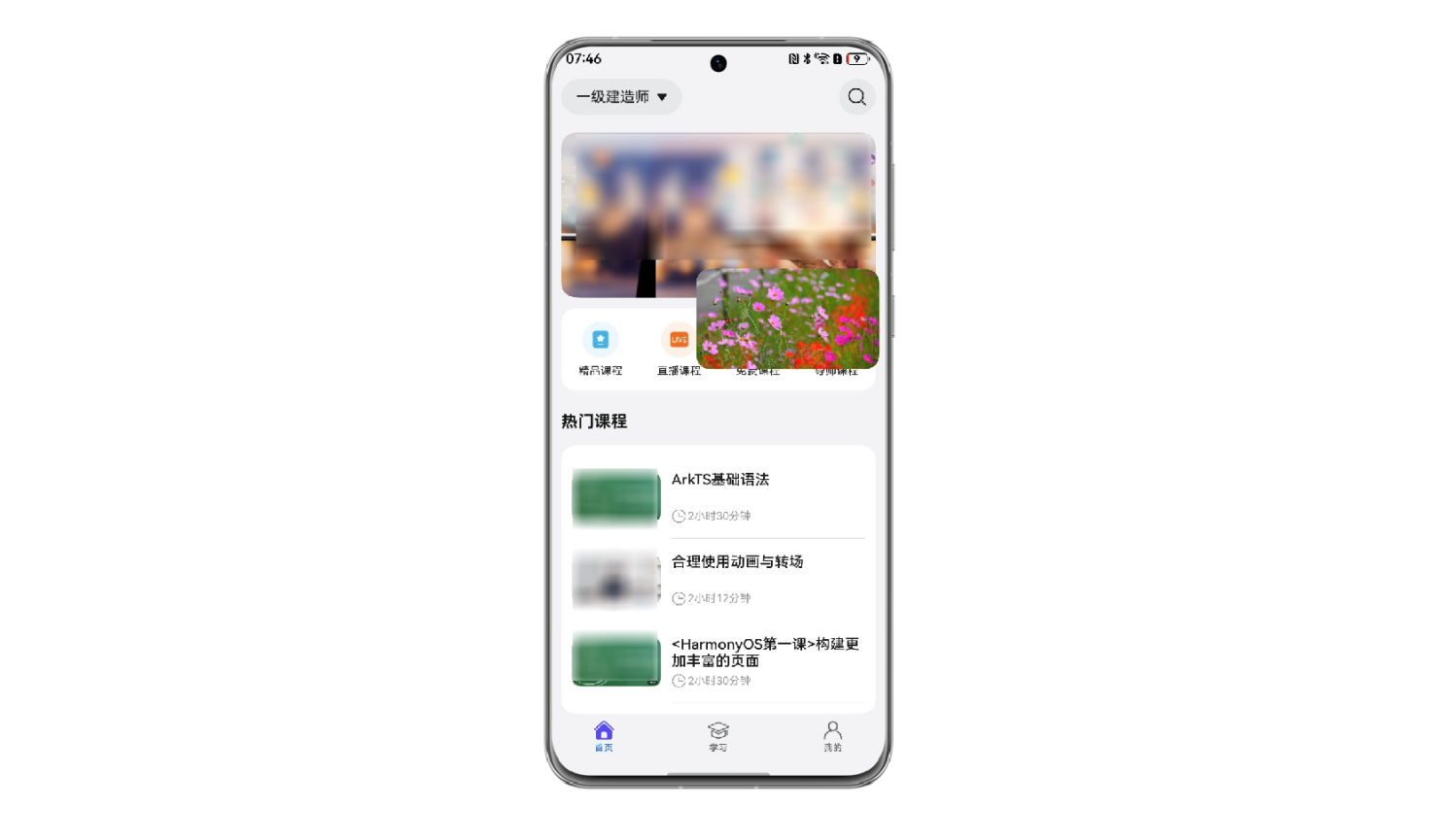 基于以上行业分析,本期将介绍鸿蒙生态市场教育类行业模板——课堂应用模板,为行业提供常用功能的开发案例,模板主要分首页、学习、我的三大模块。