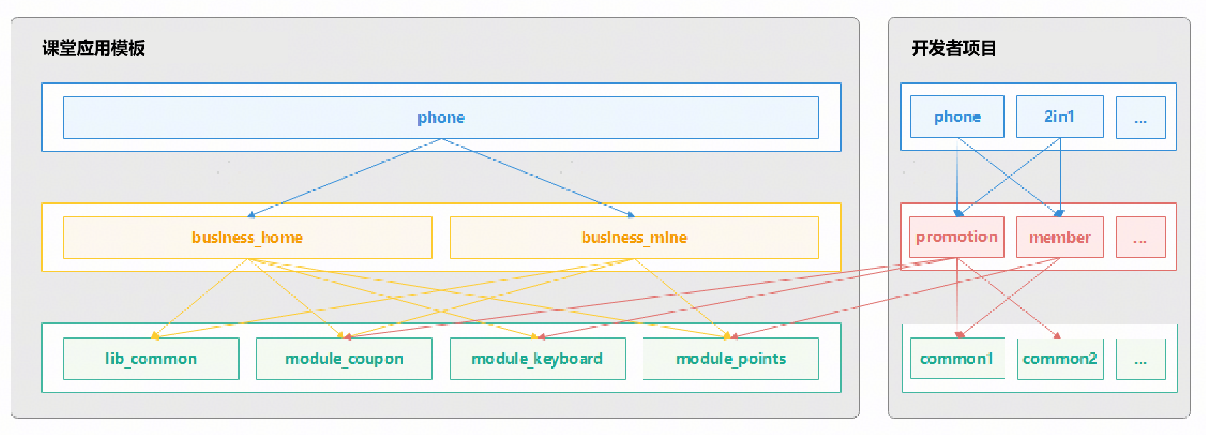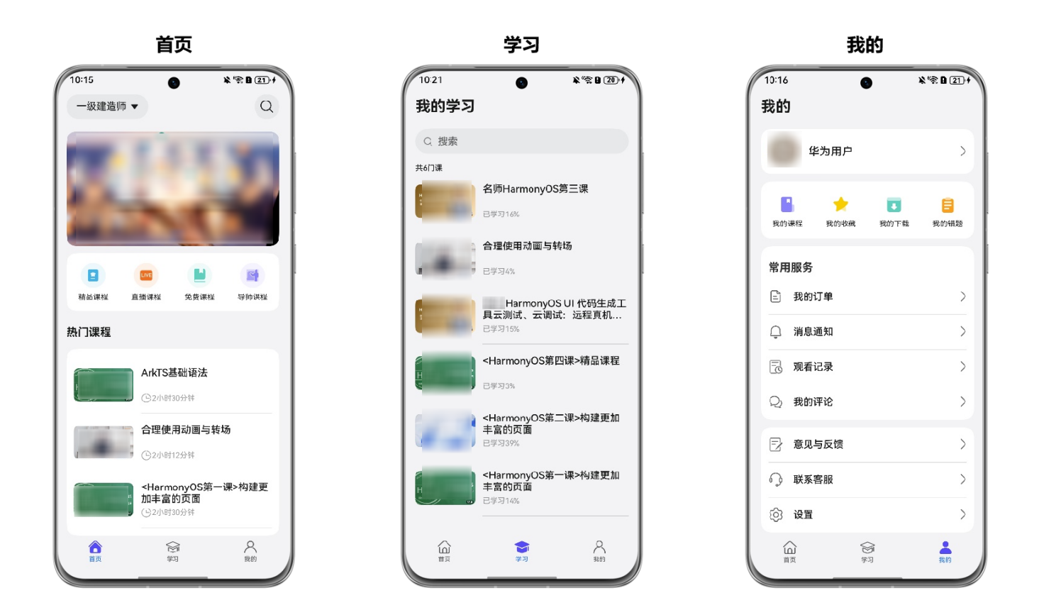 为支持开发者单独获取特定场景的页面和功能,本模板将功能完全自闭环的部分能力抽离出独立的行业组件模块,不依赖公共基础能力包,开发者可以单独集成,开箱即用,降低使用难度。基于以上行业分析,本期将介绍鸿蒙生态市场教育类行业模板——课堂应用模板,为行业提供常用功能的开发案例,模板主要分首页、学习、我的三大模块。若开发者已搭建好自己的应用工程,但暂未实现其中的部分场景能力,可以选择取用其中的业务组件,集成在