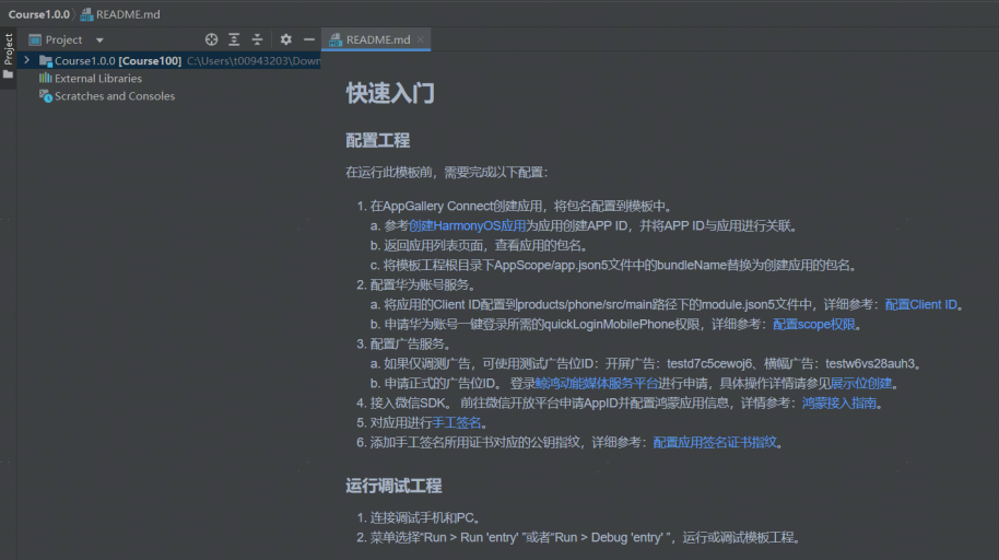 - 打开模板工程,根据README说明中的快速入门章节,将自己的应用信息配置在模板工程内,即可运行并查看模板效果。