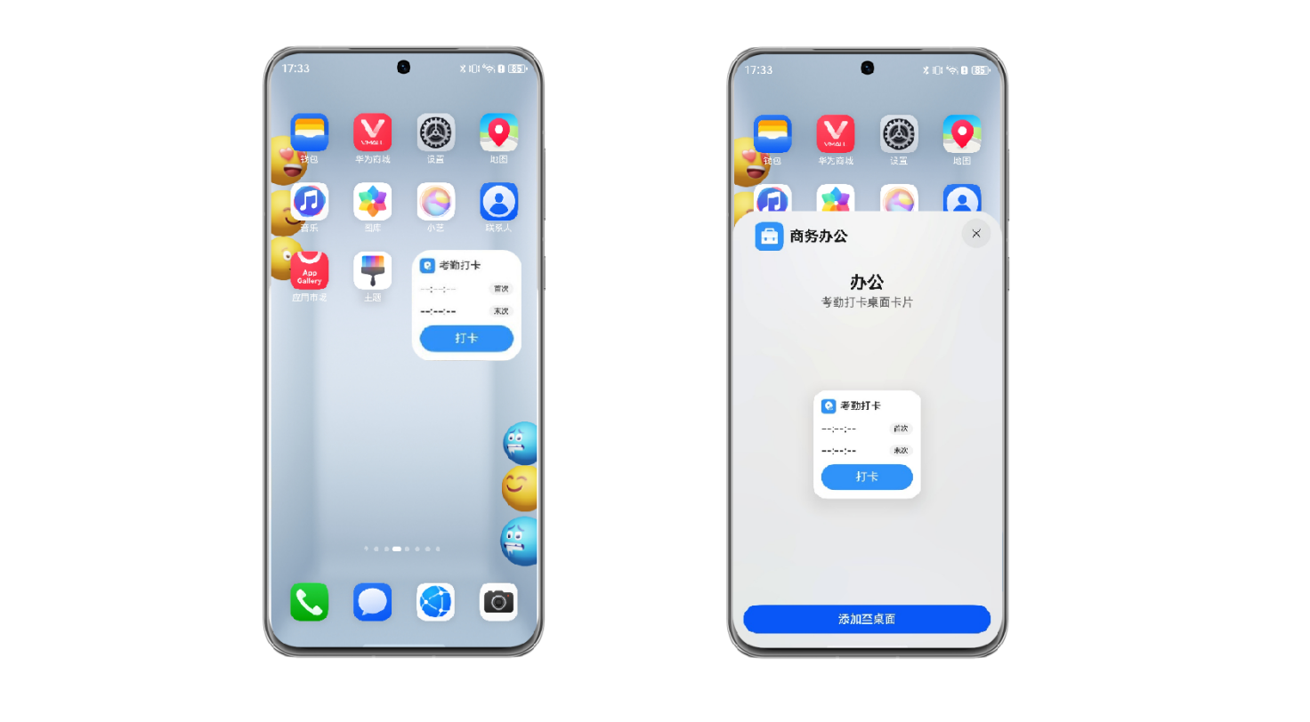 - 本模板已集成华为账号、地图、日历等服务,只需做少量配置和定制即可快速实现华为账号的登录、考勤打卡、待办和日程管理等功能。