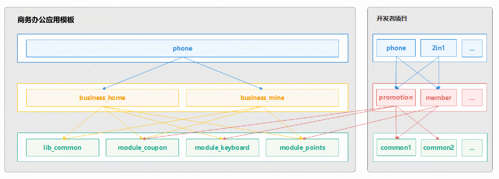 - 公共能力层:存放公共能力,包括公共UI组件、数据管理、外部交互和工具库等共享功能。