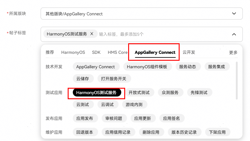 发布渠道:华为开发者联盟官网 → 支持 → 社区 → 话题 → AppGallery Connect 版块→帖子标签请选择“HarmonyOS测试服务”。