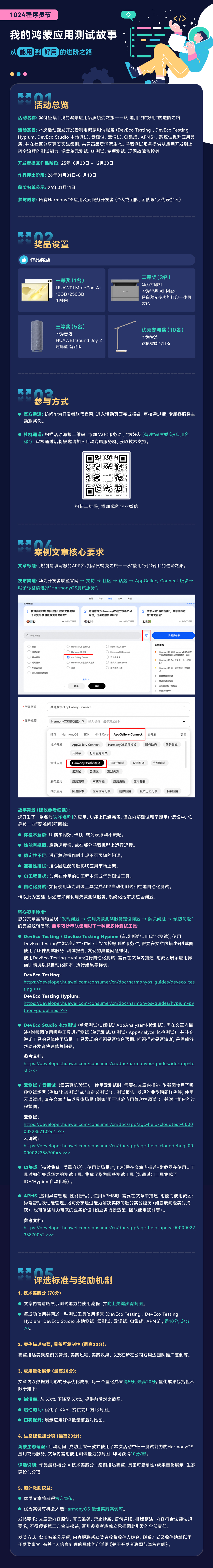 活动宗旨:本次活动鼓励开发者利用鸿蒙测试服务(DevEco Testing 、DevEco Testing Hypium、DevEco Studio 本地测试、云测试、云调试、CI集成、APMS),系统性提升应用品质,并在社区分享真实实践案例,共建高品质鸿蒙生态。鸿蒙测试服务提供从应用开发到上架全流程的测试能力,涵盖单元测试、UI测试、专项测试、现网故障监控等。