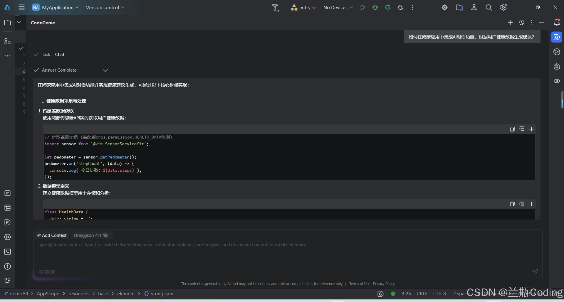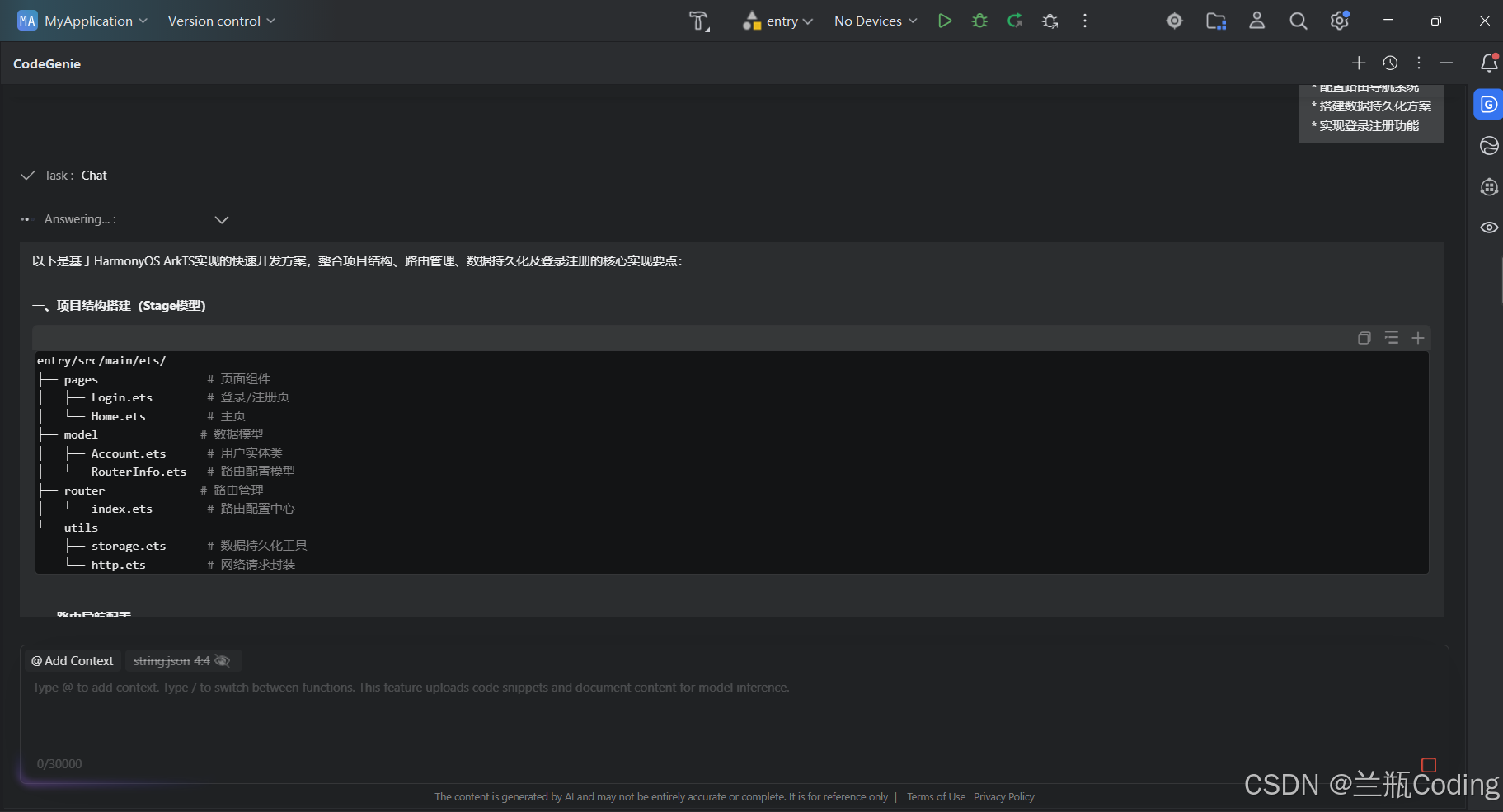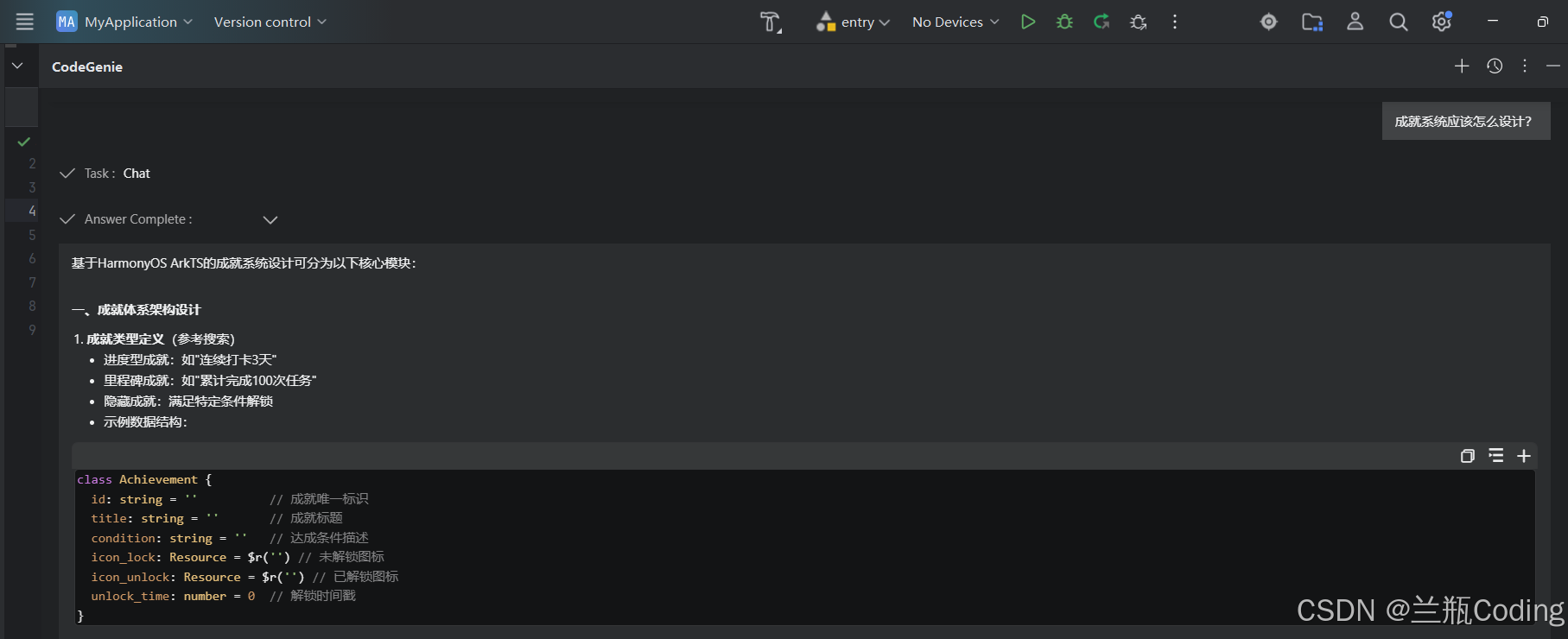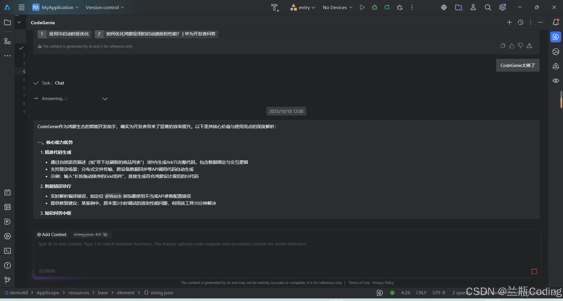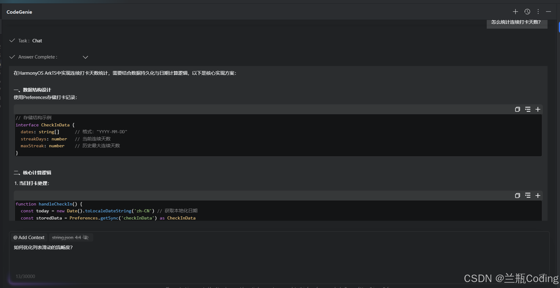几秒钟后,CodeGenie给出了详细的回答,不仅列出了LazyForEach和Recycler组件的使用方法,还解释了虚拟化技术的原理,甚至提供了一段示例代码。张磊仔细看完,发现这些建议都很专业,完全契合鸿蒙开发的最佳实践。