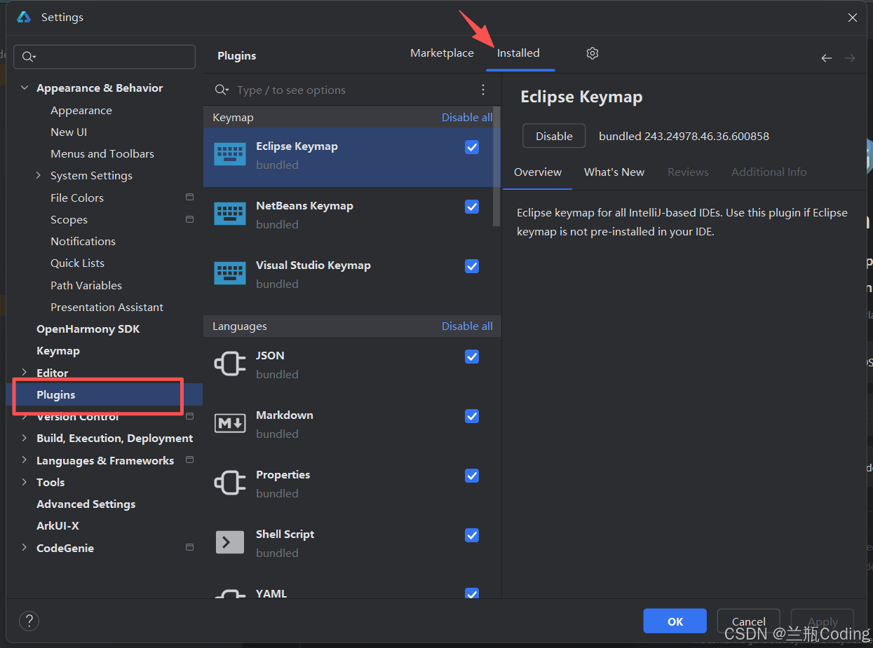 - 选择Plugins --> Installed,然后点击右边的插件设置按钮。