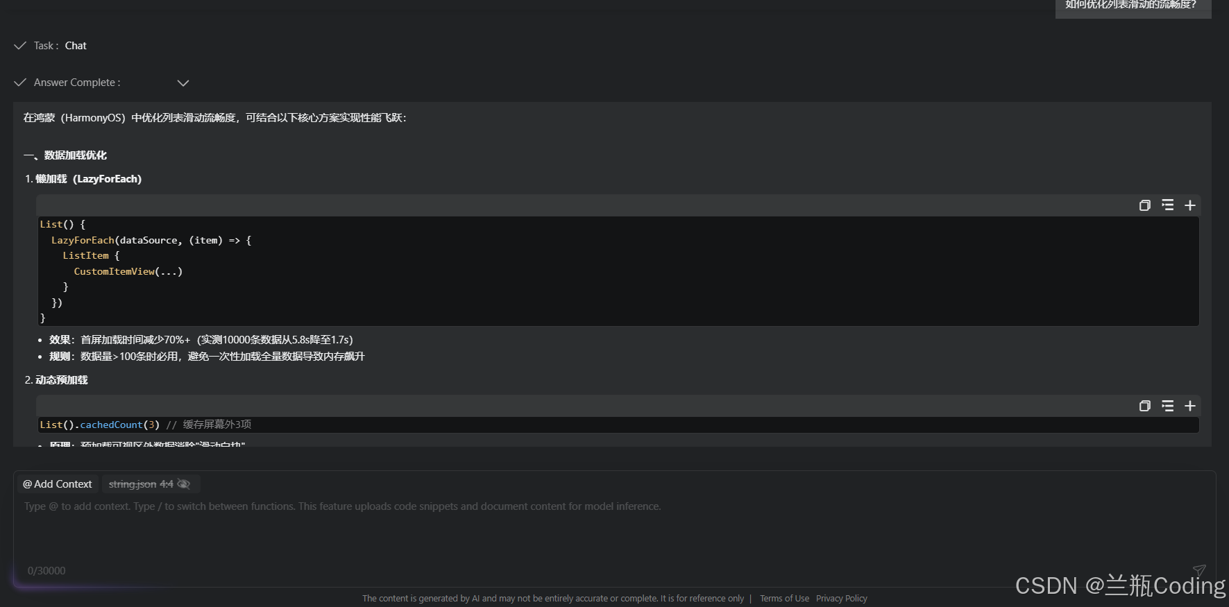 他决定先用一个实际问题来测试。项目中有个困扰了团队好几天的问题:在实现一个复杂的列表界面时,当数据量较大时,滚动会出现明显卡顿。张磊在CodeGenie的对话框中输入:"HarmonyOS中如何优化长列表的滚动性能?"