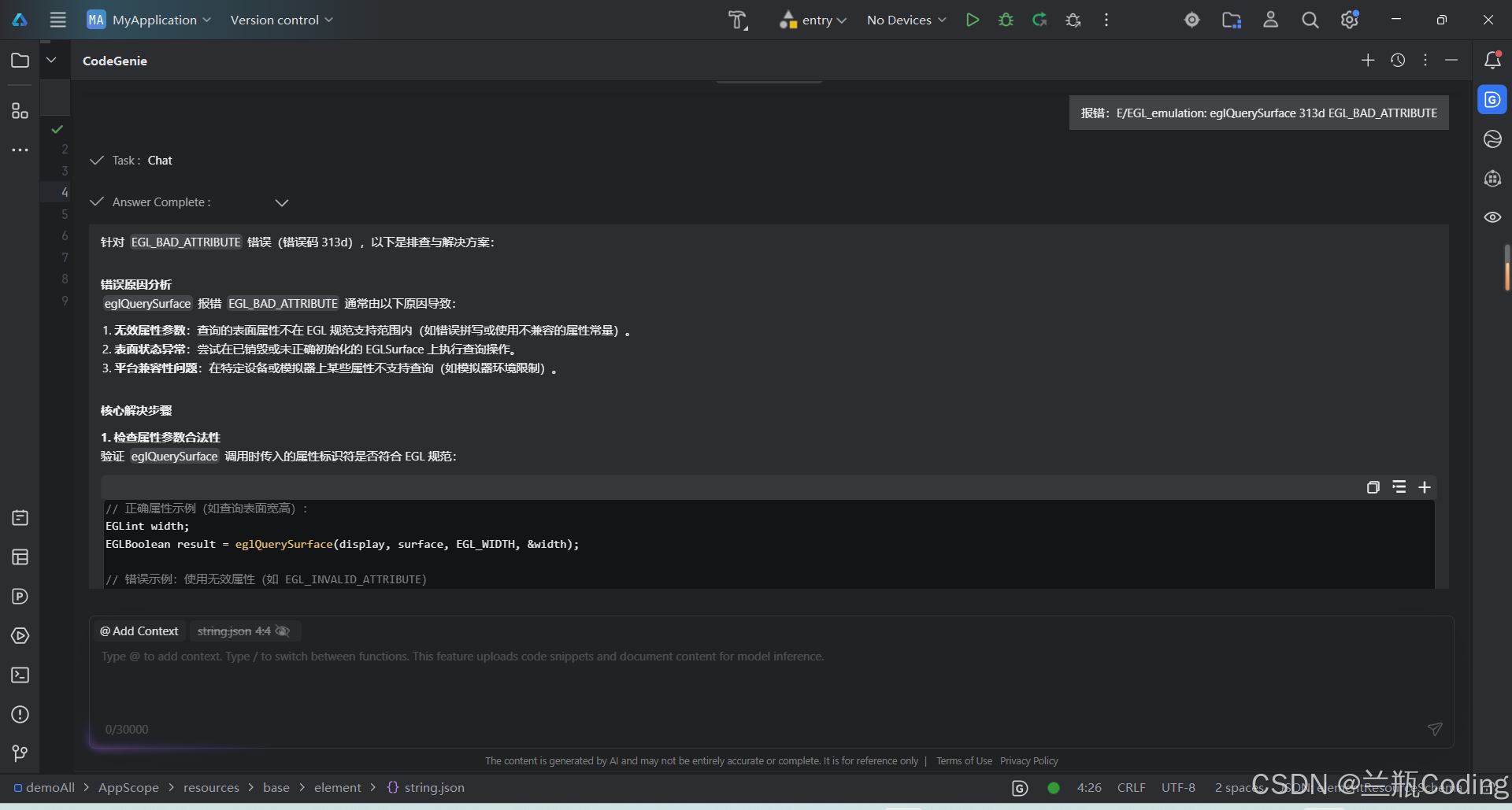 他迫不及待地又测试了几个问题,从状态管理到性能优化,从UI布局到数据存储,CodeGenie的回答都令人满意。最让张磊惊喜的是,当他把一段报错的代码贴进去询问时,CodeGenie不仅准确指出了错误原因,还给出了修改建议,按照建议修改后,代码顺利编译通过。