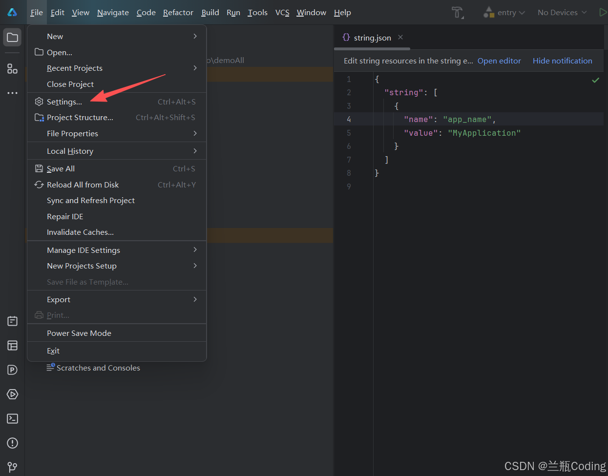 - 打开DevEco Studio,左上角选择Settings打开。