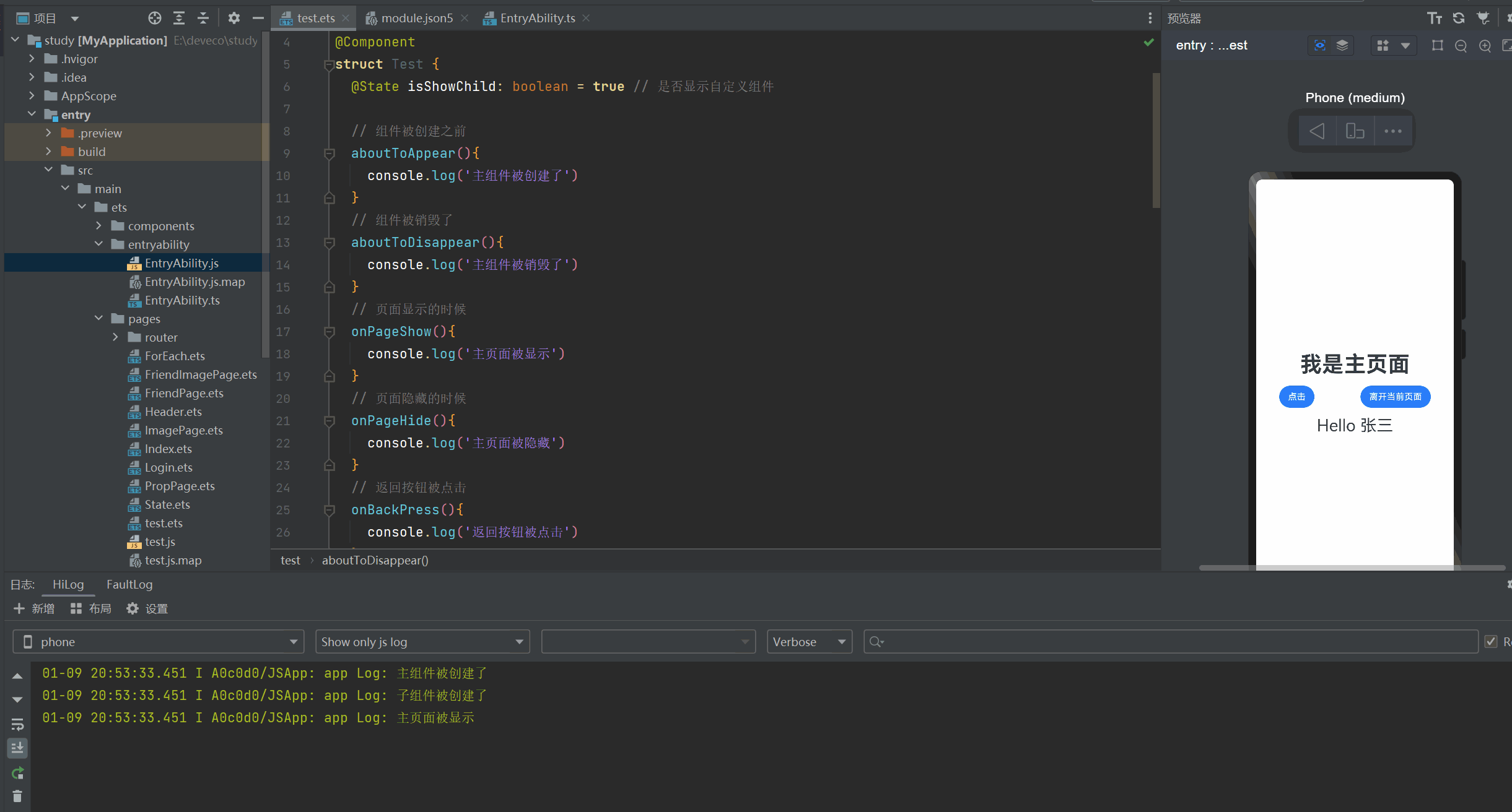 页面:即应用的 UI 页面。可以由一个或者多个自定义组件组成,@Entry 装饰的自定义组件为页面的入口组件,即页面的根节点,一个页面有且仅能有一个@Entry。只有被@Entry 装饰的组件才可以调用页面的生命周期。
