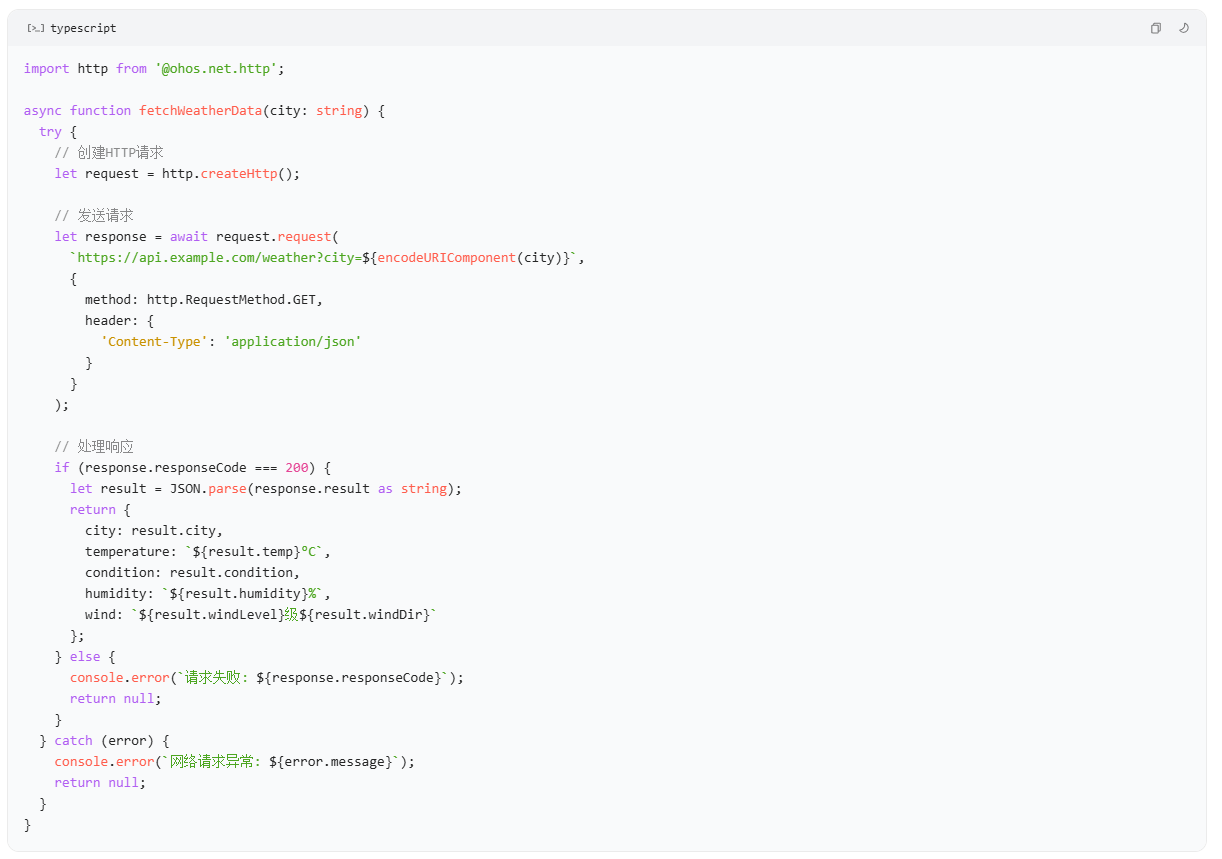 鸿蒙应用通过@ohos.net.http模块实现网络请求: