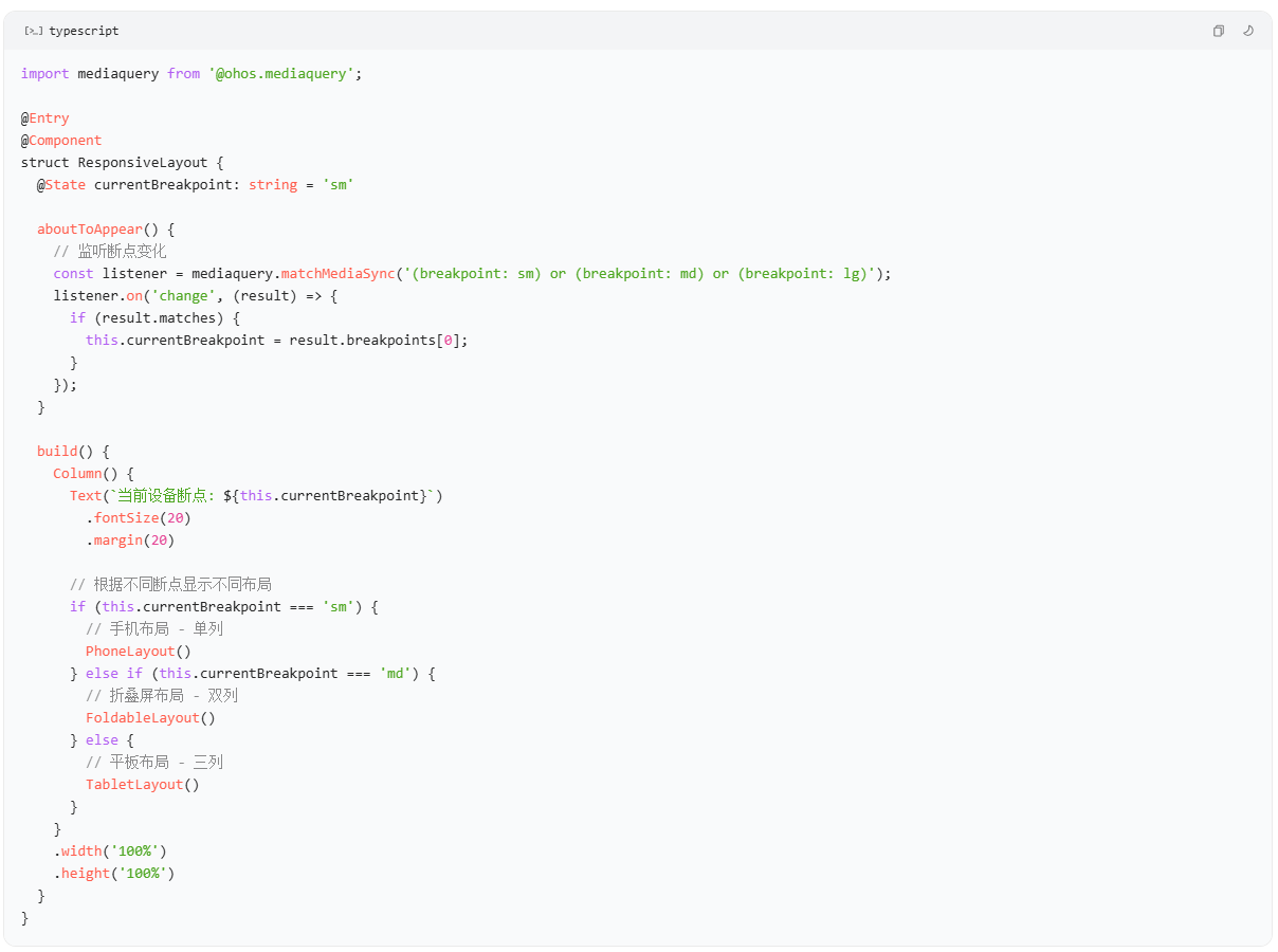 鸿蒙的多端适配能力是其核心优势之一,支持一套代码运行在多种设备上: