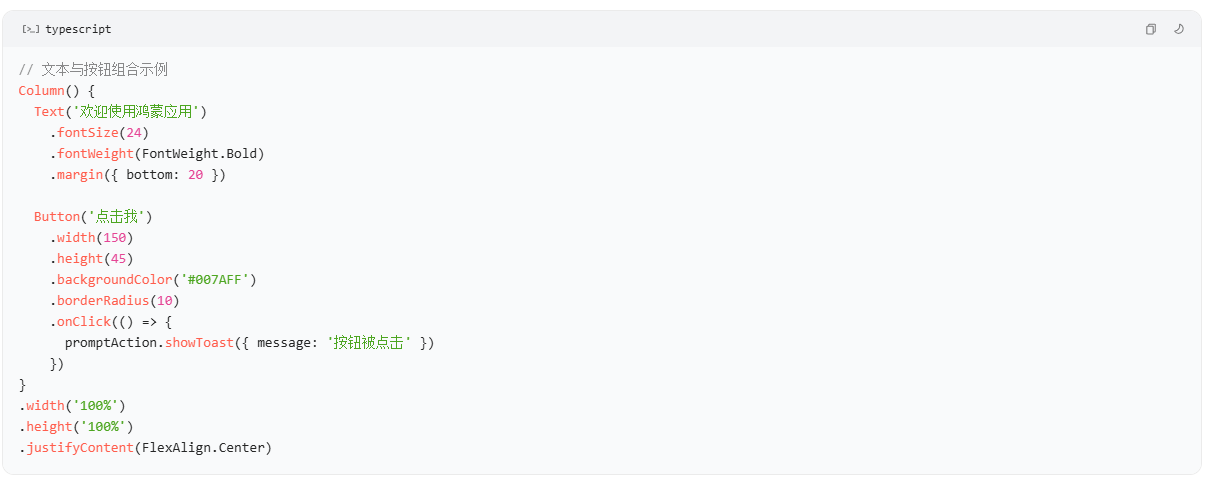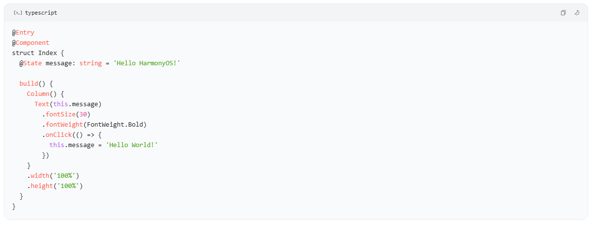 @Entry:标记当前组件为页面入口@Component:声明自定义组件@State:创建一个 "数据盒子",数据变化将触发 UI 更新Column:垂直布局容器,像 "从上到下" 摆放物品Text:文本组件,用于展示文字内容onClick:点击事件,修改 "数据盒子" 中的值