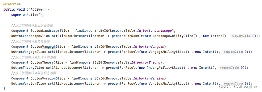 主界面主要实现的功能为,在用户点击按钮时跳转至对应界面。实现的方法比较简单,只需为按钮绑定事件监听,当监听到按钮按下时,调用presentForResult()方法完成导航即可。实现该逻辑的核心代码如下: