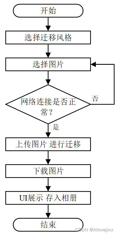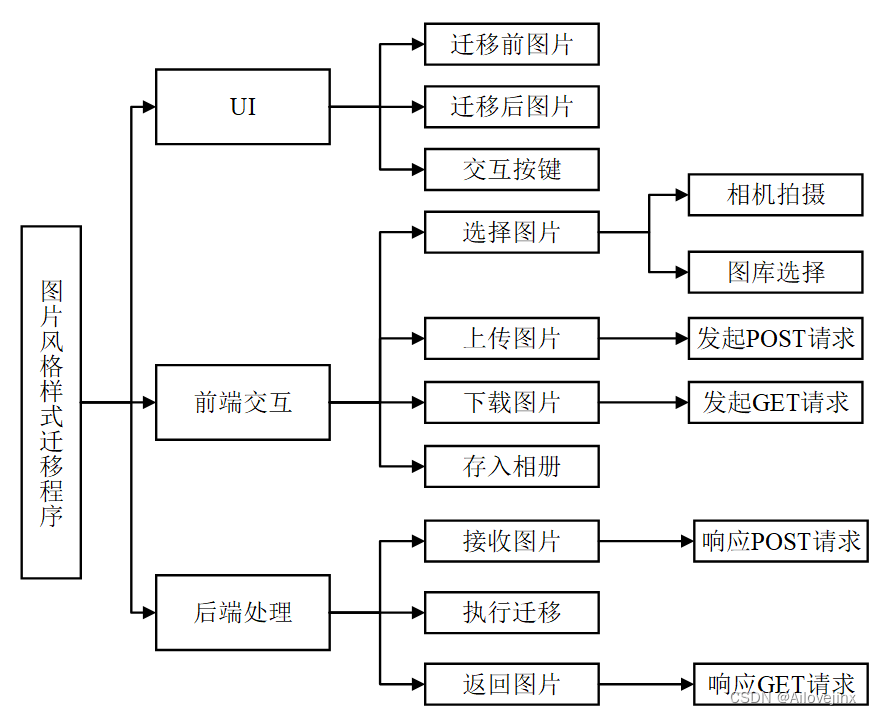 本项目基于CS架构,利用Java语言,在鸿蒙开发工具DevEco Studio中开发了一款能够进行图片风格样式迁移的程序,实现对图片添加山水画风格滤镜和梵高风格滤镜的功能。本项目最终可以部署在实机上进行使用。1总体设计图片风格样式迁移是一项利用另一图像的样式重建图像的技术。在该领域内,实现风格迁移的算法有很多,如使用CNN、GAN来生成艺术风格的图像等。Jun-Yan Zhu等人在文献[1]中提出