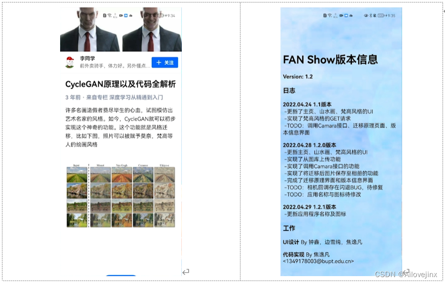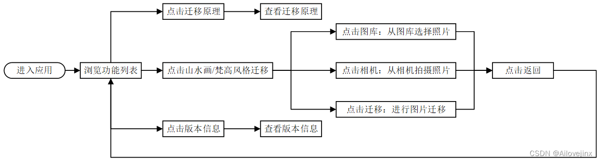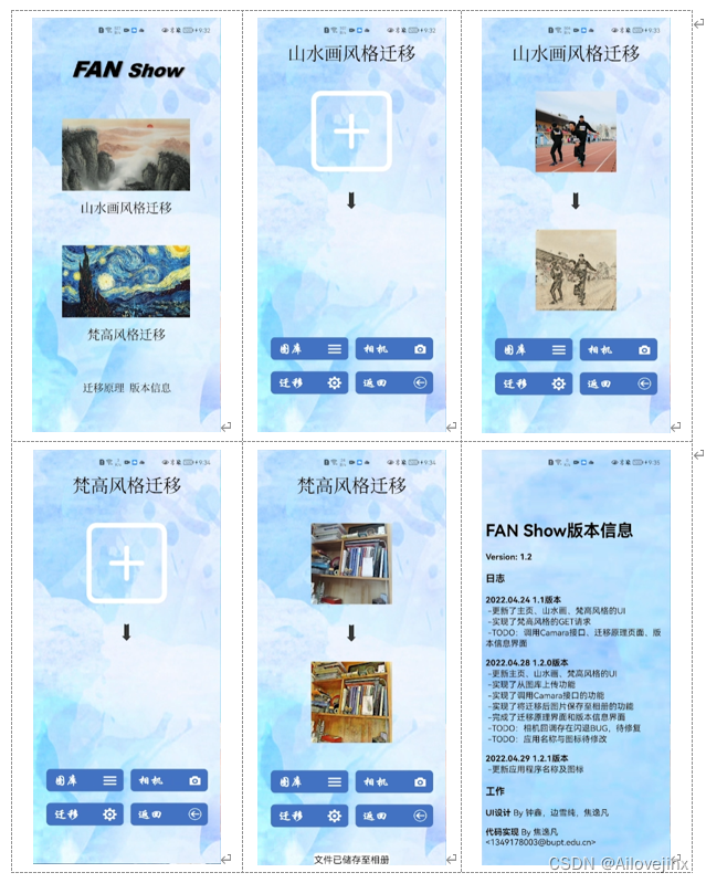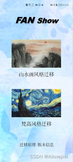 本项目的UI效果如图 5所示。图 5-1为程序主界面,用户可通过点击导航至4个子功能页面(山水画风格迁移、梵高风格迁移、迁移原理、版本信息)。图 5-2为山水画风格迁移界面,可通过点击按钮来进行图片选取、图片迁移、返回主界面等操作。图 5-3为获取迁移结果后的山水画风格迁移界面。图 5-4与图 5-5为梵高风格迁移界面,其布局与山水画风格的类似。图 5-6为版本信息界面。