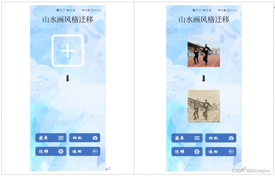 山水画风格迁移界面分为图片展示区域与按钮交互区域两部分。在图片展示区域,呈现原图与迁移后的图片。在按钮交互区域,用户可点击图库按钮从图库中选择待迁移照片,也可点击相机按钮,对拍摄的照片进行样式迁移。点击迁移按钮,可将图片进行转换。稍等片刻后,迁移后的图片将呈现在界面中,并自动保存至图库。点击返回,可退回至主页界面。