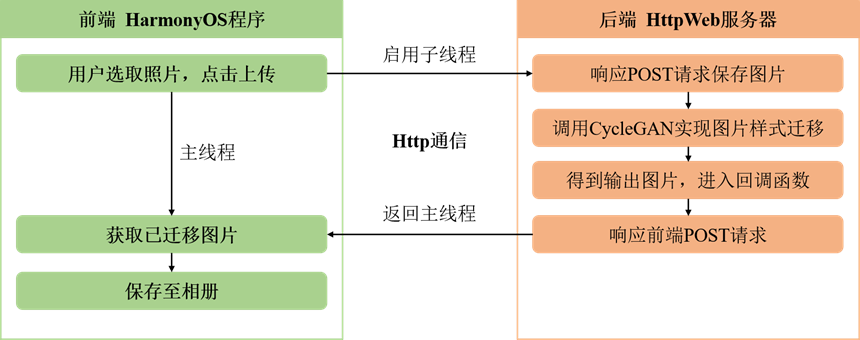 下载图片[5]:程序执行上传图片的POST请求后,将等待迁移结果,并提交GET请求。后端响应该请求,同样以字节流的方式将迁移后图片传输至前端,前端将字节流转换为PixelMap位图格式,储存至相册,并调用HarmonyOS中JavaUI的setPixelMap()方法,实现UI界面的更新。