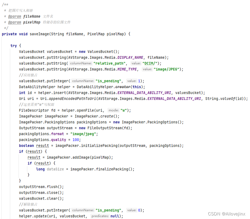 储存图库:鸿蒙设备图库中的图片默认存放在DCIM目录下,因此,只需将读取到已迁移的图片从字节流转换为jpeg格式即可。需要注意的是,由于需要进行写入操作,需要在config.json中申请储存权限。