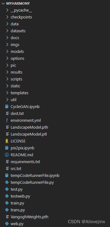 项目后端部分的服务目录结构如图 4所示,其中checkpoints目录下存放的是已经训练好的迁移模型,包括梵高风格与山水画风格。results目录下存放的是迁移后的图片。web.py文件是后端程序的入口,用于启动服务器,响应http请求,并调用模型进行迁移。