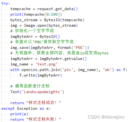 - 调用模型:根据前端访问的URL地址调用Test()函数,若路由为/upload/landscape,则进行山水画迁移;若路由为/upload/vangogh,则进行梵高风格迁移。