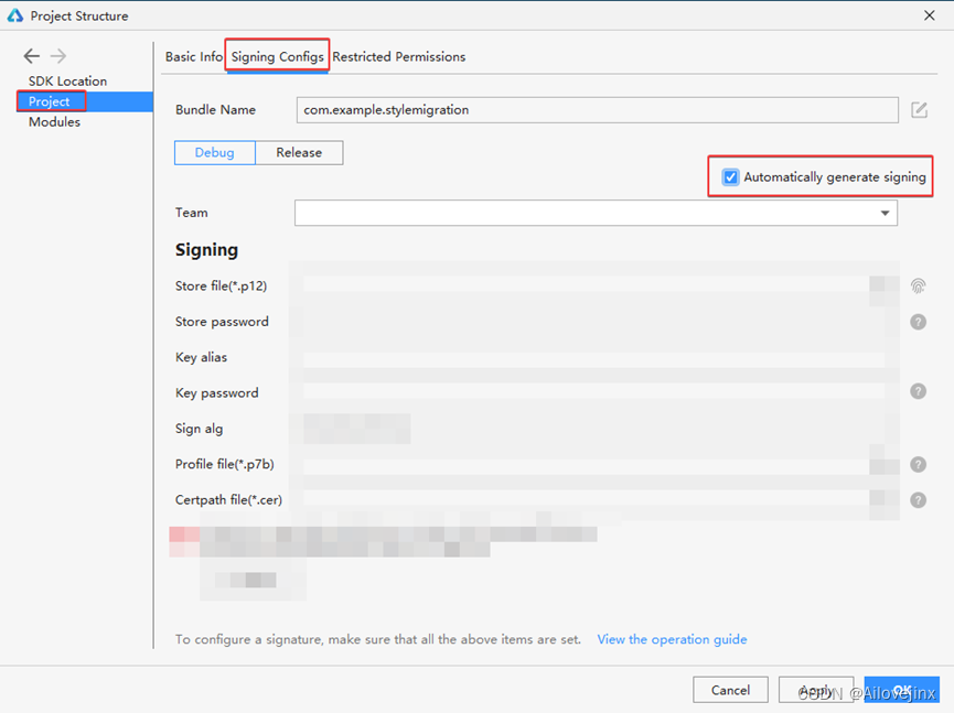 点击File > Project Structure > Project > Signing Configs,打开签名配置页面,勾选“Automatically generate signing”,等待重新签名然后,然后点击OK即可。