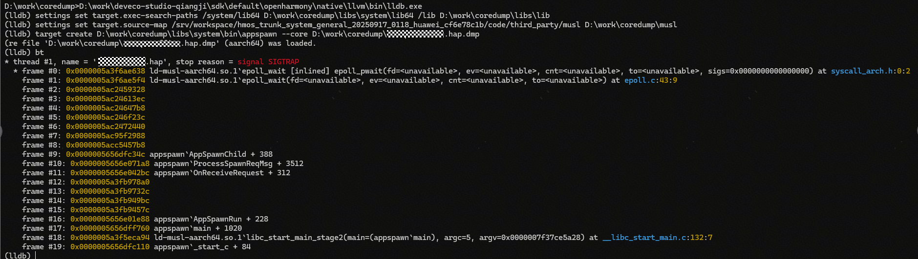 target create D:\work\coredump\libs\system\bin\appspawn --core D:\work\coredump\xxx.hap.dmp