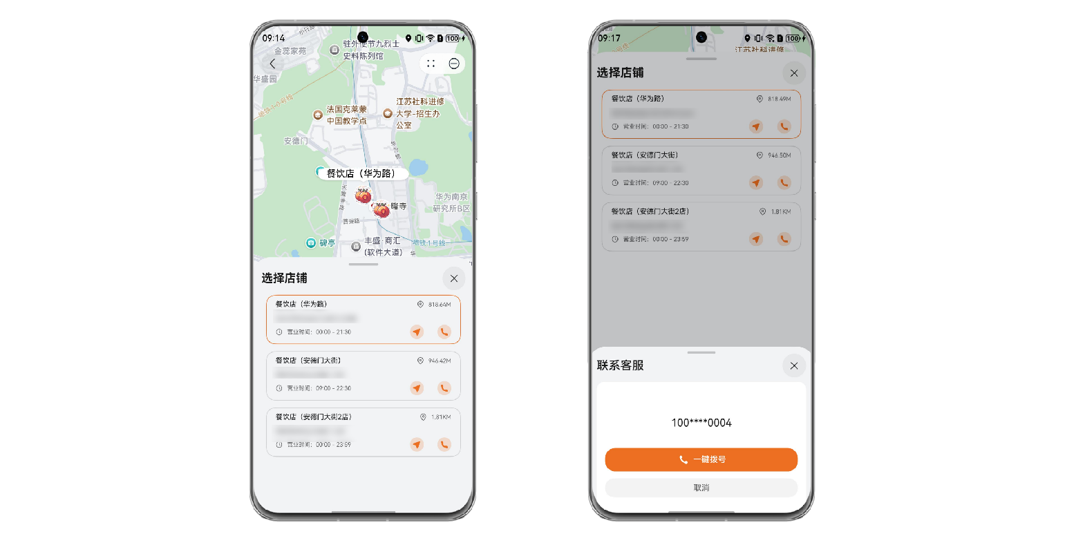 - 用户可以通过选择店铺实现店铺切换功能。页面地图通过华为地图可以展示店铺位置和距离;页面列表展示店铺信息,并且支持店铺导航和拨打电话。