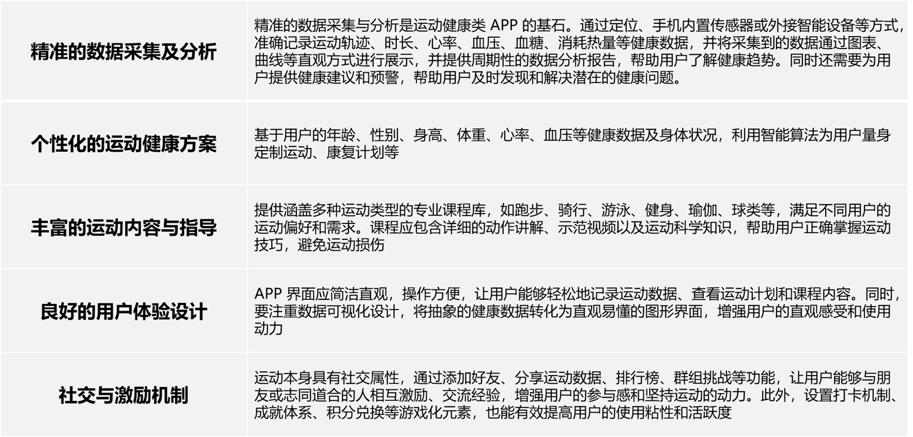 运动健康类 APP 的核心及关键在于精准的数据采集与分析、个性化的运动/健康管理方案制定、良好的用户体验设计以及社交激励机制等方面。
