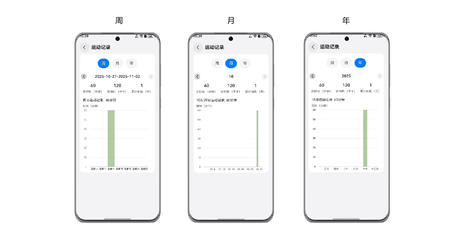- 通过柱状图的形式呈现周、月、年的运动记录数据。