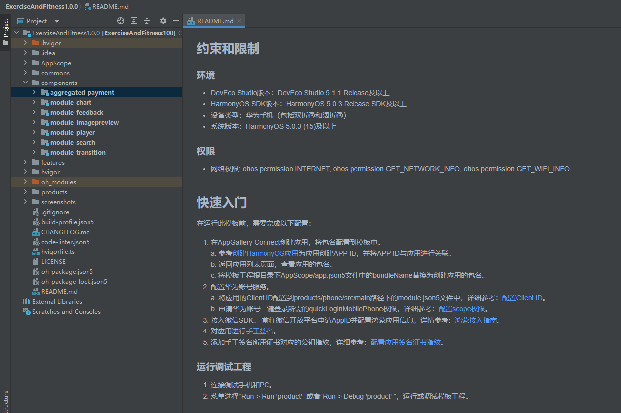 - 本模板为运动健身类应用提供了常用功能的开发样例,已集成华为账号等服务,只需做少量配置和定制即可快速实现华为账号的登录、媒体播放等功能。