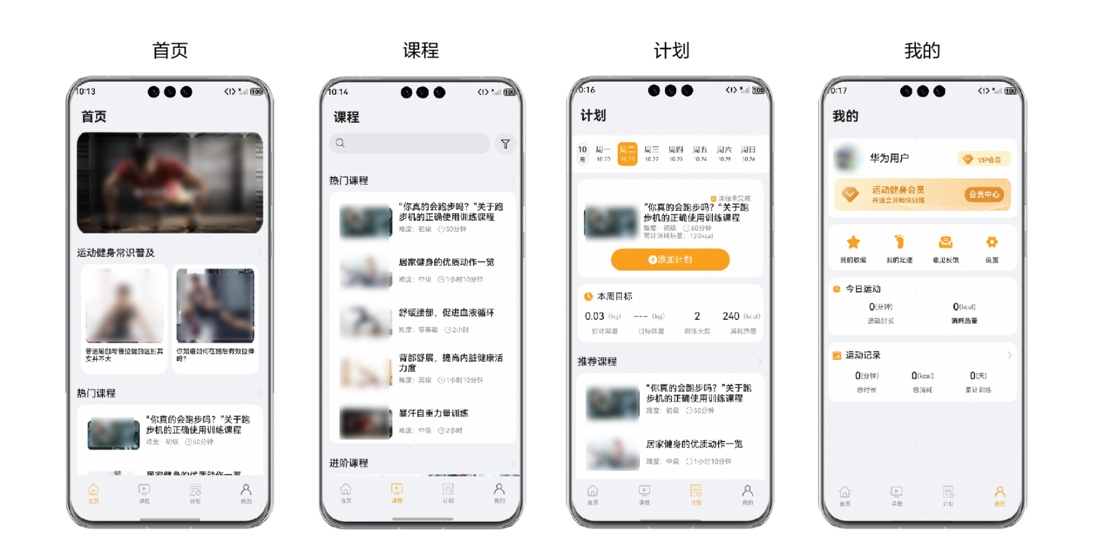 基于以上行业分析,本期将介绍鸿蒙生态市场运动健康类行业模板——运动健身应用模板,为行业提供常用功能的开发案例,模板主要分首页、课程、计划和我的四大模块。