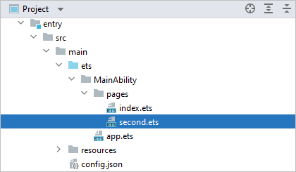 - 新建第二个页面文件。在“Project”窗口,打开“entry > src > main > ets > MainAbility”,右键点击“pages”文件夹,选择“New > eTS File”,命名为“second”,点击“Finish”。可以看到文件目录结构如下: