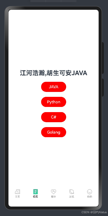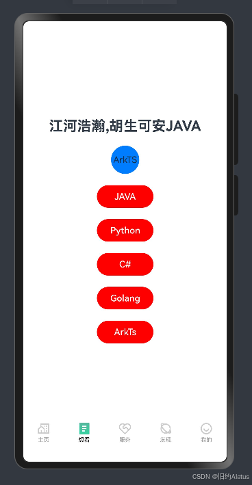 @Component export default struct See { @State options:string[] = ["JAVA","Python","C#","Golang"]; @State answer:string = "____"; build() { Column({space:20}){ Row(){ Text("江河浩瀚,胡生可安").fontSize(25).fontWeight(FontWeight.Bold); Text(this.answer).fontSize(25).fontWeight(FontWeight.Bold); }; Button({type:ButtonType.Circle}){ Text("ArkTS") }.onClick(()=>{ this.options = ["JAVA","Python","C#","Golang","ArkTs"]; }).width(50).height(50); ForEach(this.options,(item:string) => { Button(item).width(100).backgroundColor(Color.Red).onClick(()=>{ this.answer = item; }); }); } } }@Component