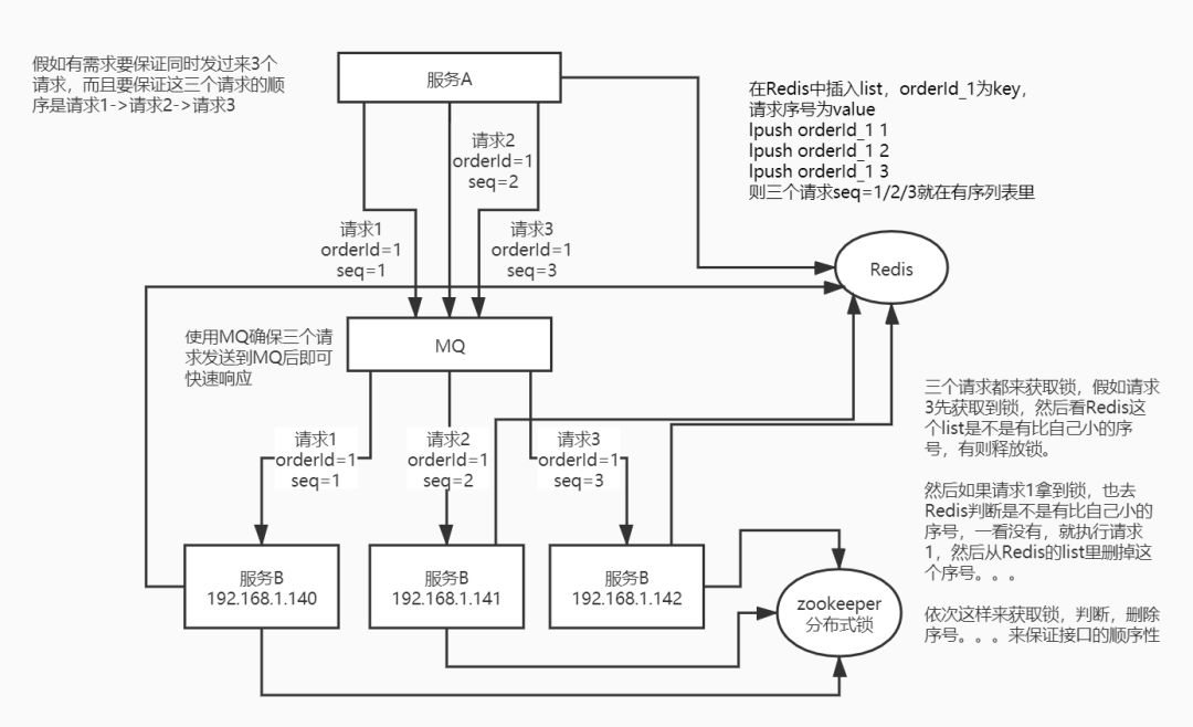 服务A发送的三个有序请求请求1、2、3,依次发到MQ,然后服务B的多个实例从MQ消费。假如分别是三个实例拿到1、2、3三个请求,则当请求执行时需从zk获取锁,才能执行。所以此时A还要指明这三个请求的执行顺序,即seq=1、2、3,服务B才知道执行顺序。