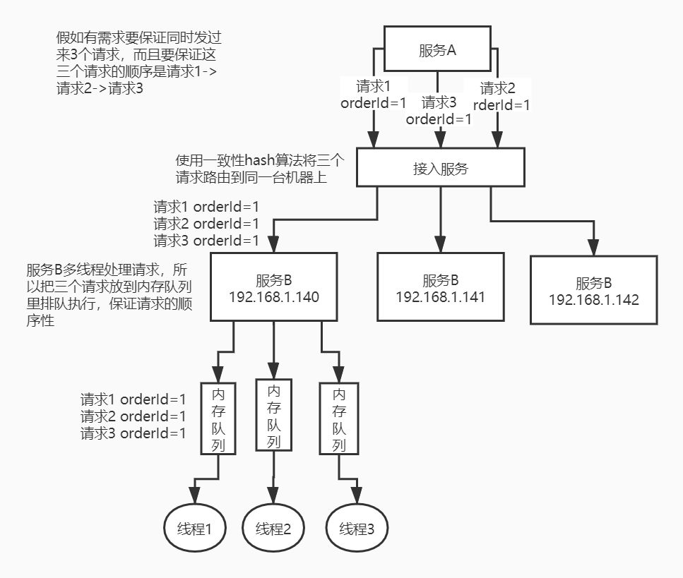 将比如某个订单id对应的请求都给分发到某机器,在那个机器上因为可能还是多线程并发执行,你得立即将某个订单id对应的请求扔一个内存队列,强制排队,确保顺序性。