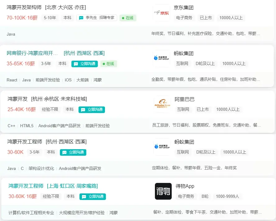 随着鸿蒙系统的崛起,众多头部互联网企业开始重视对鸿蒙技术的投资和开发。美团、京东等公司纷纷在招聘平台上发布了鸿蒙相关的开发岗位,这些岗位不仅数量众多,而且提供的薪资也高于市场平均水平。这些大型企业的积极响应显示出他们对鸿蒙生态系统的高度认可,以及对未来发展潜力的乐观预期。